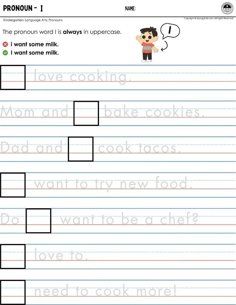 In this fill-in-the-blank exercise, students will learn that the pronoun "I" is always capitalized. They should write it with a capital letter, regardless of its position in the sentence.